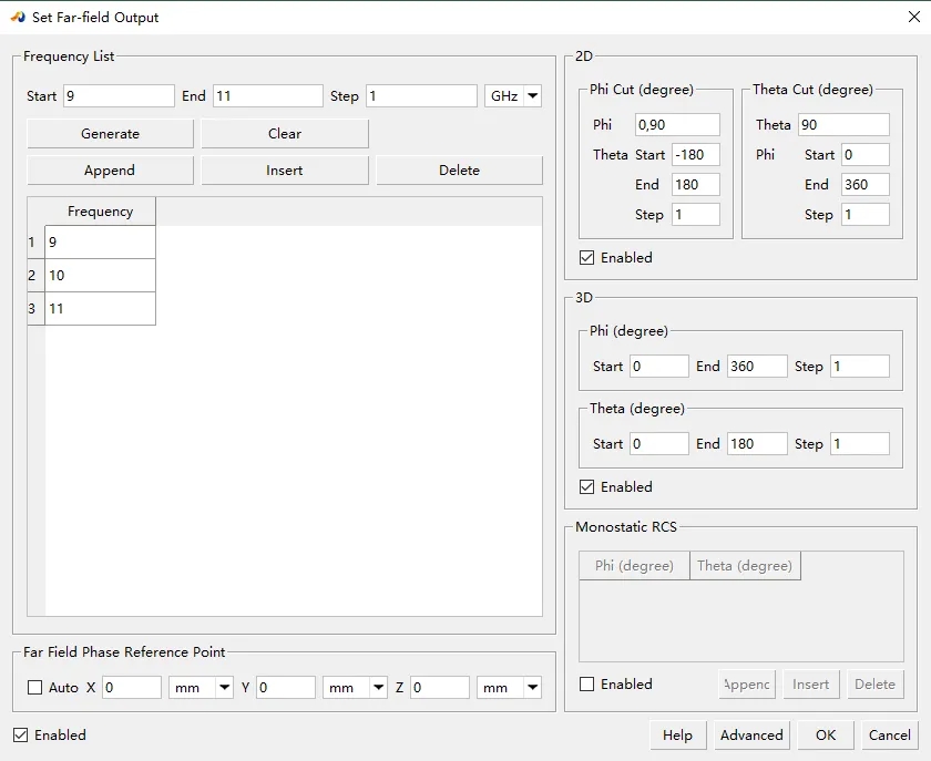 選中需要觀測表面電流的物體,點(diǎn)擊Surf-current,設(shè)置需要觀測的頻點(diǎn);點(diǎn)擊Output中的Far-field,設(shè)置需要觀測遠(yuǎn)場的頻點(diǎn)和2D/3D。