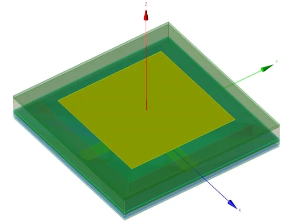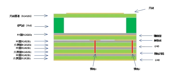 本案例為8層壓合板,層與層之間通過PP層粘連,疊層如下圖所示,主要包括天線貼片層、空氣腔層、縫隙層、微帶線層和饋電網(wǎng)絡(luò)層,復(fù)雜的層疊設(shè)計容易造成鏈路損耗增大、天線增益降低。通過PhySim ACEM來確認(rèn)此設(shè)計的S參數(shù)、遠(yuǎn)場輻射方向圖和極化增益。