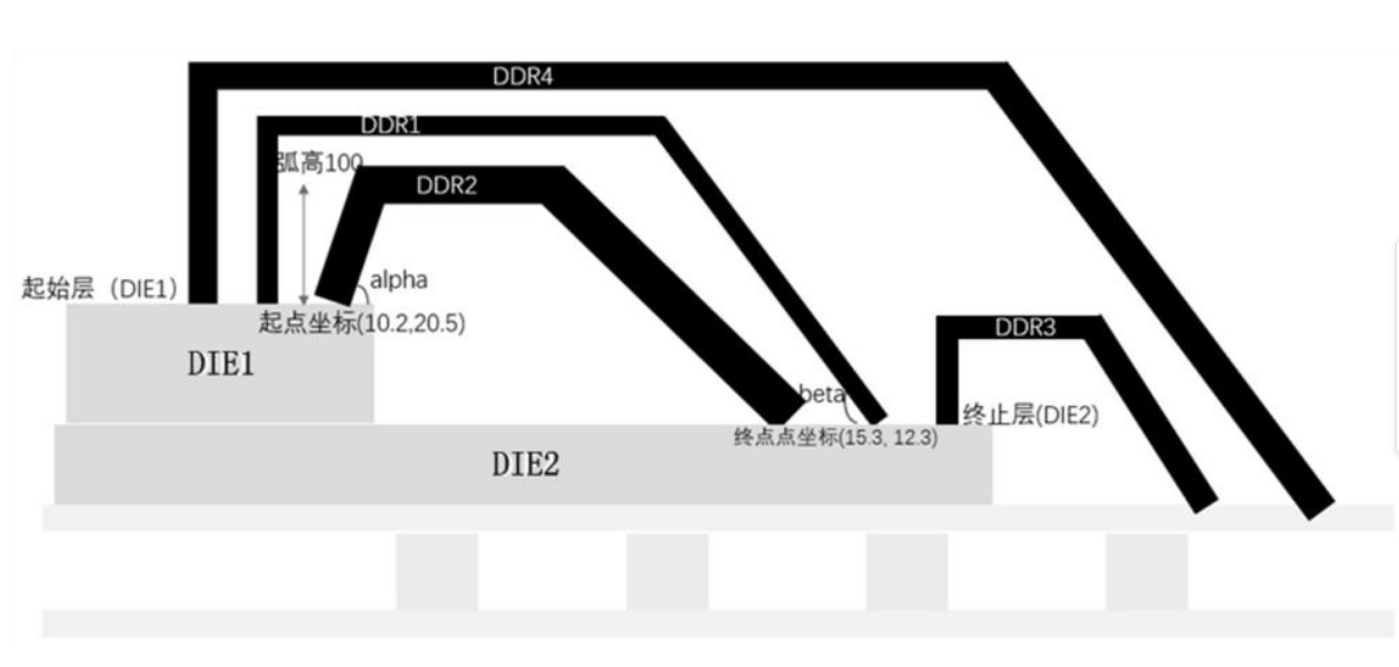 本發(fā)明提供的一種多層打線封裝的三維模型識別及構(gòu)建方法,定義不同的打線名稱,易于區(qū)別不同層次的打線。不同信號可映射不同的打線名稱。本發(fā)明多層打線封裝的三維模型識別及構(gòu)建方法,通過識別包含打線層次、打線材料、方向、直徑、弧高、芯片高度、alpha角度、beta角度、起始層、終止層、起點坐標(biāo)、終點坐標(biāo)的文件來構(gòu)建三維模型,為封裝多物理場仿真分析提供了真實的模型支撐;通過將建模所需要的信息記錄到特定文件,使三維建模易于實現(xiàn)和修改,生成的三維模型不同打線有對應(yīng)的弧高,有效避免了不同打線物理短路的情況,模型更加貼合實際。解決了利用傳統(tǒng)封裝基板制造文件無法實現(xiàn)三維打線模型的難題。