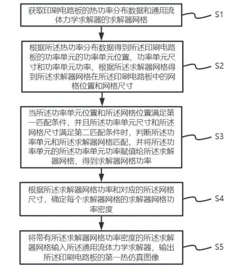 通過將熱功率分布數(shù)據(jù)的功率單元的功率值賦值給與其匹配成功的求解器網(wǎng)格,使通用流體力學(xué)求解器可以根據(jù)印刷電路板的熱功率分布數(shù)據(jù)對印刷電路板進(jìn)行熱仿真,提高了通用流體力學(xué)求解器的兼容性,并通過第一匹配條件和第二匹配條件,使通用流體力學(xué)求解器網(wǎng)格可以得到熱功率分布數(shù)據(jù)中準(zhǔn)確的功率值,進(jìn)一步提高了求解器網(wǎng)格賦值的精度,從而提高流體力學(xué)求解器根據(jù)熱功率分布數(shù)據(jù)輸出的熱仿真圖像準(zhǔn)確性。