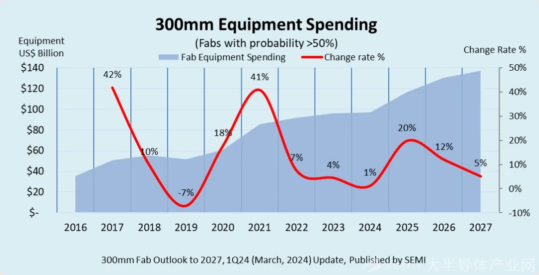 美國加州時間3月19日,國際半導體產業協會(SEMI)發布《300mm晶圓廠2027年展望報告(300mm Fab Outlook Report to 2027)》。報告指出,受內存市場復蘇以及高效能運算和汽車應用需求增長的推動,全球前端設施所使用的300mm晶圓廠設備投資預計將在2025年首次突破1000億美元,并有望在2027年達到歷史新高1370億美元。