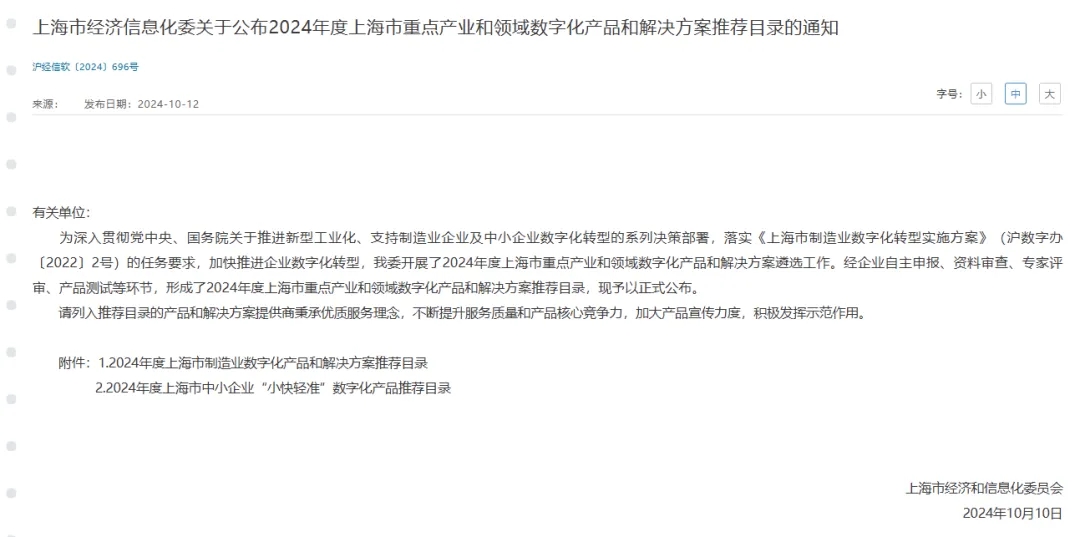 據了解,《2024年度上海市重點產業和領域數字化產品和解決方案推薦目錄》是由上海市經濟信息化委為深入貫徹黨中央、國務院關于推進新型工業化、支持制造業企業及中小企業數字化轉型的系列決策部署,落實《上海市制造業數字化轉型實施方案》(滬數字辦〔2022〕2號)的任務要求,加快推進企業數字化轉型所開展的遴選工作。