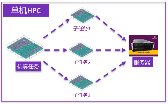 PhySim Mulan系列仿真軟件中的ACEM,擁有有限元算法FEM、FDTD時(shí)域算法等混合求解算法,以及新型高效的網(wǎng)格剖分iMESH技術(shù),開(kāi)發(fā)了兩種HPC模式用于加速計(jì)算,以應(yīng)對(duì)大規(guī)模電磁問(wèn)題的加速方案。 單機(jī)HPC:即將完整任務(wù)拆分成多個(gè)子任務(wù),派分至同一臺(tái)機(jī)器中并行計(jì)算,適用于核數(shù)較多的服務(wù)器; 多機(jī)HPC:與單機(jī)HPC類(lèi)似,但卻是將子任務(wù)派分至不同的機(jī)器中進(jìn)行并行計(jì)算,適用于需要使用更多資源來(lái)加速大尺寸模型求解的場(chǎng)景。