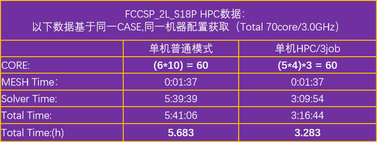本圖表展示了在相同案例(CASE)、配置和資源條件下,普通模式與單機(jī)HPC模式的效率對(duì)比: 在同樣是60core的資源下,普通模式耗時(shí)5.68小時(shí), 而單機(jī)HPC拆分成了3個(gè)子任務(wù),總資源同樣為60core,耗時(shí)僅為3.28小時(shí) 即:?jiǎn)螜C(jī)PHC模式相比普通模式,在同資源情況下效率可提升約73%