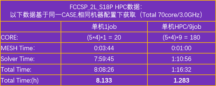 本圖表展示了在相同案例(CASE)、配置和資源條件下,普通模式與多機(jī)高性能計(jì)算(HPC)模式的效率對(duì)比。需要注意的是,HPC模式的并行效率受到數(shù)據(jù)傳輸時(shí)間、服務(wù)器響應(yīng)延遲、內(nèi)核間運(yùn)算差異以及不同機(jī)器間運(yùn)算效率不一致等多種因素的影響,因此其效率無(wú)法實(shí)現(xiàn)100%: 在單個(gè)任務(wù)僅20core的資源下,普通模式需耗時(shí)8.13小時(shí); 而多機(jī)HPC拆分成了9個(gè)子任務(wù),單個(gè)子任務(wù)20core,總資源占用為180core,耗時(shí)僅為1.28小時(shí) 即:多機(jī)HPC效率相比普通模式效率可提升約6.3倍;(多機(jī)HPC可以調(diào)用更多機(jī)器的資源用于加速仿真求解)